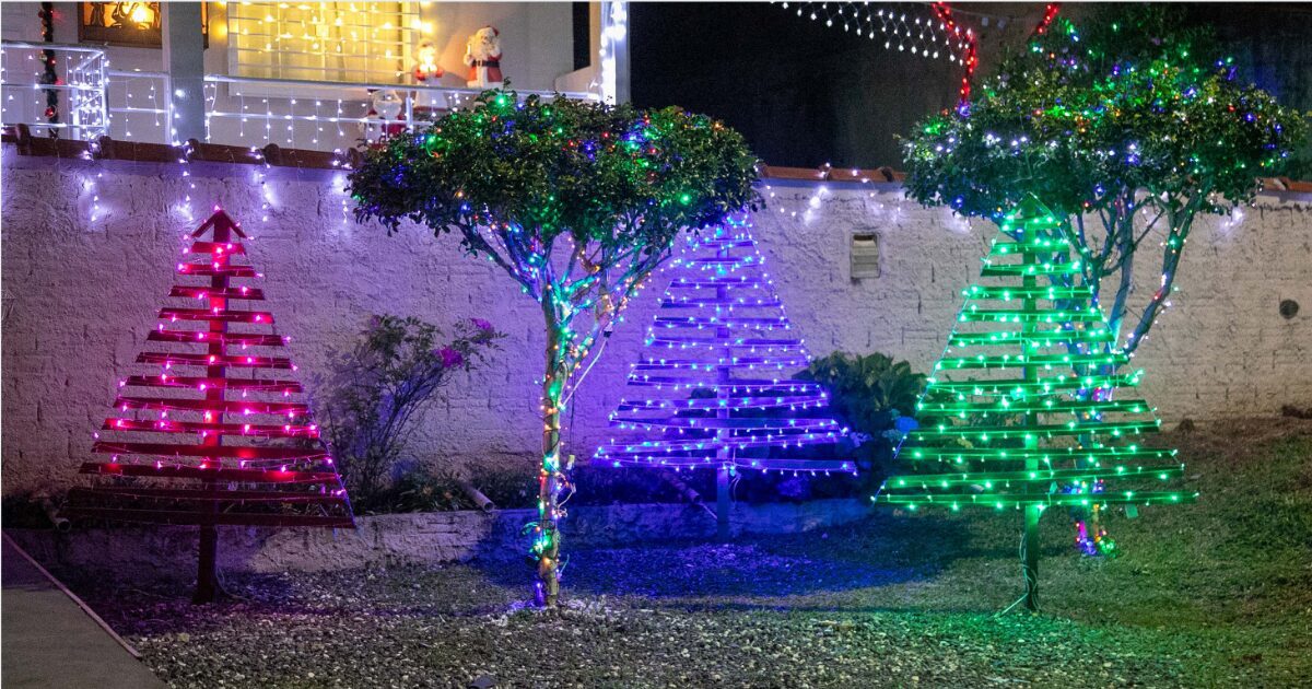 Em áreas externas é essencial tomar o cuidado de ficar longe da rede de energia – tanto na hora de instalar os adornos quanto na disposição da decoração. Caso se faça uso de enfeites em locais elevados, como beirais da casa, telhados, portões ou árvores, é importante observar a distância segura dos fios. Durante a instalação redobre a atenção com o uso de escadas ou varas para erguer a decoração, evitando risco de contato acidental com a rede elétrica.